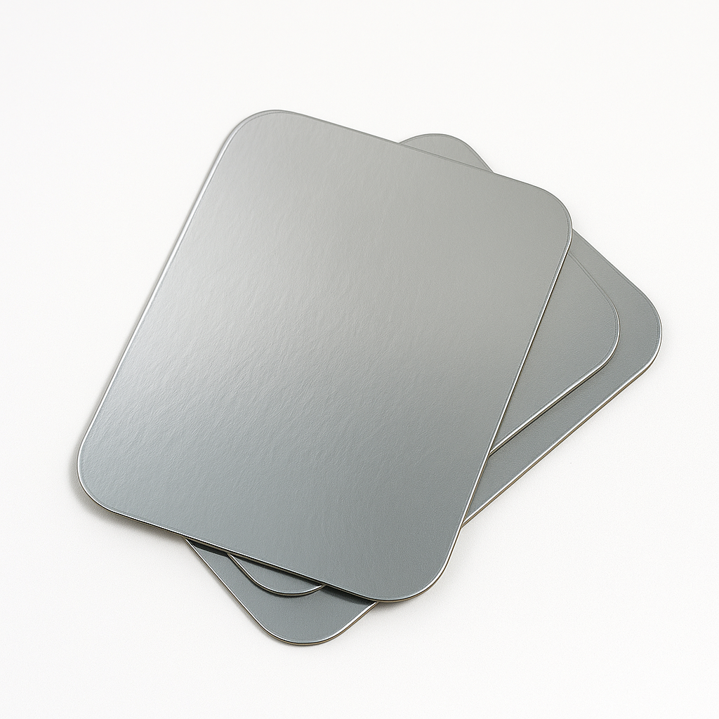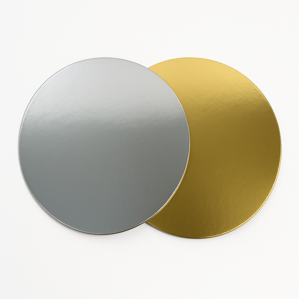 Rigid cardboard boards for cakes, pastries, and desserts with gold, silver, or black coating. They provide stability, aesthetics, and convenience for serving and packaging.